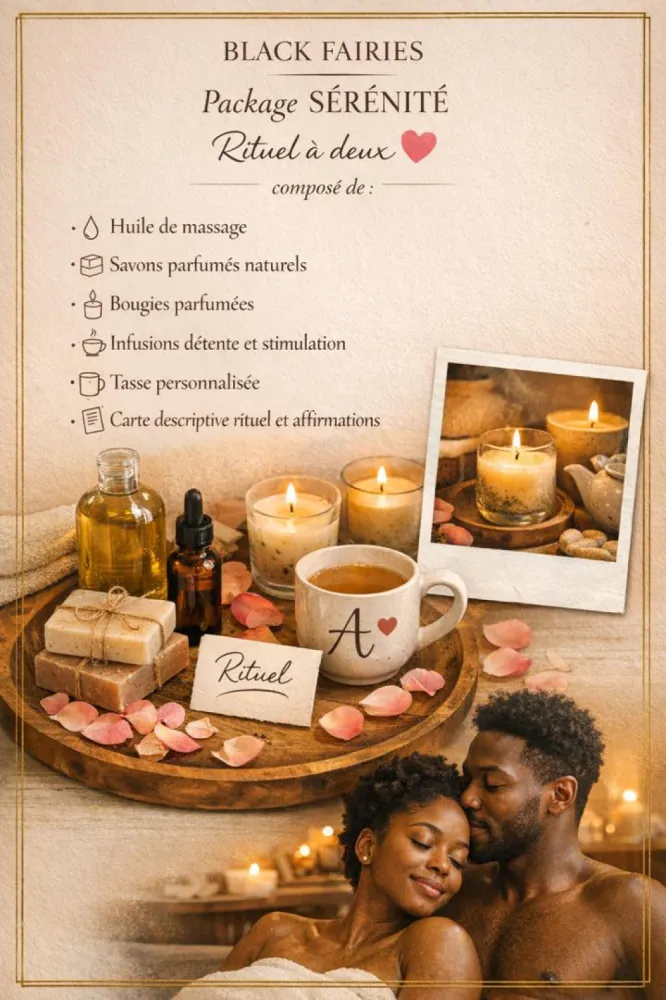 - Huile de massage - Savons parfumés rituels - Bougies parfumées - Infusion, détente et simulation - Tasse personnalisée - Carte descriptive rituel et affirmations